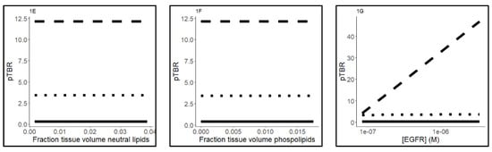 In order to study differences in tumor-to-lung contrast and whole-body distribution between microdose and therapeutic dose, the mechanistic PBPK model needs to be extended in a concentration-dependent manner. The injected dose of 11C-erlotinib corresponded with 2.2 µg (±0.46) erlotinib. When compared to the regular therapeutic dose of 150 mg, this is a >10,000-fold difference []. With this difference in dosing, lysosomal sequestration, albumin, lipoprotein, AP− and EGFR binding and EGFR target binding will become saturated, and by including these nonlinear processes, the influence of different doses on TBR can be assessed.