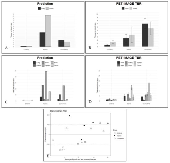 The association between PET-image-derived TBR and model-predicted TBR. (A) PET-image-derived TBR (left) vs. (B) model-predicted TBR of lung and tumor. (C) PET-image-derived TBR (left) vs. (D) model-predicted TBR of all tissues of interest. For patient data, standard deviations are given. (E) Bland–Altman plot showing accuracy of the model to predict tissue uptake. The solid black line represents the mean and the dashed lines a factor 3 of both sides of zero. Percentage of predictions falling within 3-fold: erlotinib 16.6%, afatinib 33.3% and osimertinib 100%.