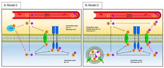 Schematic overview of the final mechanistic PBPK models for weak basic or acidic EGFR-TKIs (A: Model 1) and strong basic EGFR-TKIs (B: Model 2). The plasma compartment is depicted in red, extracellular space in yellow and intracellular space in blue. Orange hexagons “B” (base) depict the drug; purple hexagons depict H+ atoms. When depicted together, bases are protonated. When depicted separately, the base is unprotonated. Blue receptors depict epidermal growth factor receptor (EGFR), green ovals over the cell membranes are neutral (phospho)lipids (NL/NP) and acidic phospholipids (AP-). Light blue ALB is a representation of albumin. Black arrows depict processes that are included in both models, red/purple arrows depict processes specific for each model. pH values for each compartment are given. Equations for model 1 and 2 below and the model structure are further explained in the Supplemental Materials S-II,III. B = basic unprotonated drug, BH+ = protonated drug, AP- = acidic phospholipids, NL = neutral lipids PL = phospholipids, ALB = albumin, EGFR = epidermal growth factor receptor.