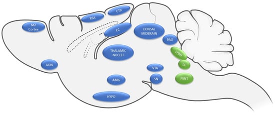 Schematic representation of NPS precursor and NPSR1 transcript distribution in the rat brain. Green circles (PSNT: principal sensory trigeminal nucleus, LPBN: lateral parabrachial nucleus and LC: peri-locus coeruleus) represent areas of NPS precursor mRNA expression, while blue circles (M2cortex: secondary motor cortex, AON: anterior olfactory nucleus, RSA: agranular retrosplenial cortex, CTX: cortex, EC: entorhinal cortex, thalamic nuclei, AMG: amygdala, HYPO: hypothalamus, dorsal midbrain; VTA: ventral tegmental area; SNC: substantia nigra, PAG: periaqueductal gray area) depict brain regions with NPSR1 transcript expression.
