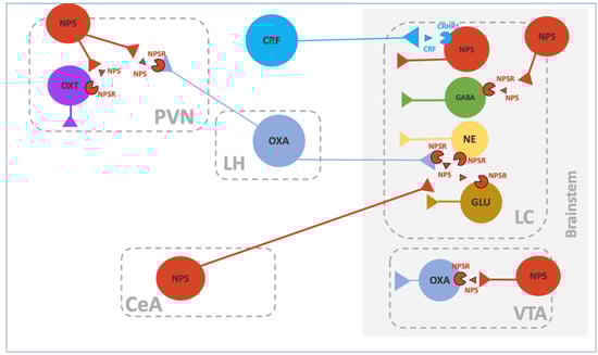 The neurobiological interactions of NPS are summarized in Table 1. A schematic representation of the relationship of NPS/NPSR with other neurotransmitter systems is reported in Figure 2.