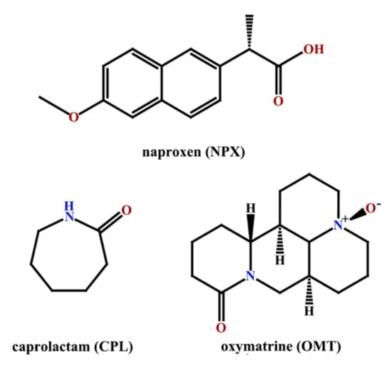 NPX with a purity of >99% and OMT with a purity of >98% were purchased from Wuhan Far Cheng Co-Creation Technology Co., Ltd. (Wuhan, China). CPL with a purity of >99% was obtained commercially from Sinopharm Chemical Reagent Co., Ltd. (Shanghai, China), and all solvents and reagents (analytical grade) were obtained from Beijing Chemical Works (Beijing, China). The molecular structures of the compounds are shown in Figure 1.