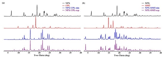 PXRD patterns for API, CCFs, and the corresponding co-crystals. (a) NPX–CPL; (b) NPX–OMT.