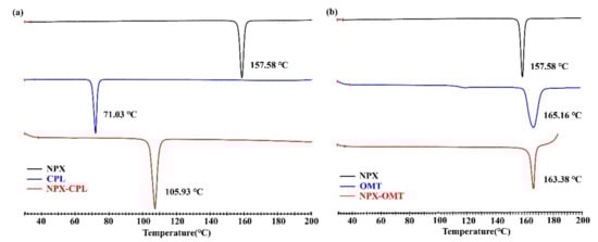 Figure 4 displays the thermal characteristics of NPX–CPL, and NPX–OMT obtained through DSC. These endothermic peaks, which corresponded to the melting points of the co-crystals, occurred at significantly different temperatures for NPX, CPL, and OMT, indicating the formation of new phases but not physical mixtures. In general, high melting points indicate thermodynamic stability [32,33]; therefore, the stability of NPX–OMT was higher than that of NPX–CPL. In addition, the endothermic peak values of NPX–CPL, and NPX–OMT were between those of API and CCF. These values were close to that of the corresponding CCF, which indicated that the stability of CCF was extremely relevant to that of the combinations.
