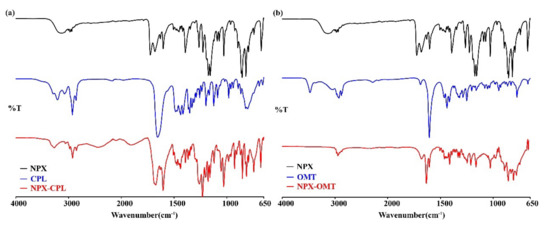 FT-IR spectra were recorded for the NPX, CCFs, and co-crystals. SC XRD data showed that both of the co-crystals were formed by the hydrogen bonding, and the IR spectra of the co-crystals were different from API and CCFs, which also confirmed the formation of hydrogen bonding. In fact, the formation of hydrogen bonds can cause the IR wavenumbers to shift toward shorter ones [34]. In NPX–CPL, hydrogen bonds formed not only between the carboxyl hydrogen in NPX and the carbonyl oxygen in CPL but also between the amino hydrogen in CPL and the carbonyl oxygen in NPX. The band attributed to νO-H at 3143 cm−1 in the IR spectrum of NPX black shifted to 3055 cm−1, and that attributed to νN-H at 3292 cm−1 in the IR spectrum of CPL blue shifted to 3270 cm−1 in the NPX–CPL spectrum. In addition, the νC=O stretching band at 1725 cm−1 in NPX and 1654 cm−1 in the CPL spectra appeared in the NPX–CPL spectrum at 1673 and 1603 cm−1, respectively. This finding explained the hydrogen bonding site of NPX with CPL. In NPX–OMT, the νO-H stretching band at 3143 cm−1 in NPX shifts to lower wavenumbers due to the formation of hydrogen bonding. Table 3 shows the main vibrational data of the co-crystals and their preliminary attribution, and Figure 5 displays the IR spectra.