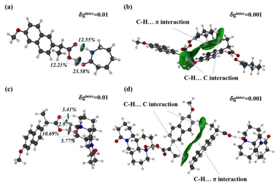 Moreover, the IGMH analysis method was utilized to pinpoint classical hydrogen bonds and weak interactions between molecules in the crystal lattice. The molecules in an asymmetric unit in the co-crystals were extracted, and the intermolecular interactions and interactions between two asymmetric units were analyzed by the IGMH method. As shown in Figure 6, the classical hydrogen bonds, such as O-H…O and N-H…O, were elliptic 𝛿ginter isosurfaces of 0.01 a.u. with a blue color in the central area. The darker the shade of blue, the stronger the molecular interaction. Therefore, the hydrogen bond O-H...O was stronger than the hydrogen bond N-H...O. For non-classical hydrogen bonds, such as C-H…O, the interactions were relatively weak. Thus, no blue region was observed on the isosurfaces. In addition, the strength of the hydrogen bond can be determined by the contribution of atomic pairs to intermolecular interactions by the IGMH method. Figure 6a shows that the contribution of atomic pairs O1-H23 and N3-H21 was 23.58% and 12.55%, respectively. O-H...O was stronger than the hydrogen bond N-H...O, consistent with the assessment of the isosurface color. Given that the interactions between two asymmetric units were extremely weak in the 𝛿ginter isosurface of 0.01 a.u., the isovalue was adjusted to 0.002 a.u., and the interactions can be revealed by green isosurfaces. The interactions were C-H…π and C-H…C, which were dominated by dispersion effects.