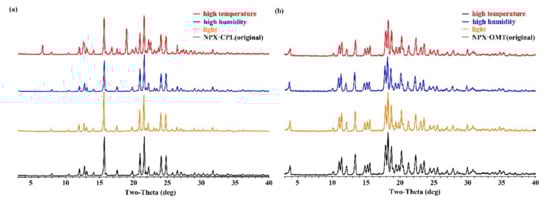 After the formation of co-crystals, the physical and chemical properties changed along with them (Figure 8). For instance, the melting point of NPX–CPL decreased, and that of the NPX–OMT increased. Therefore, stability experiments were carried out to observe whether the co-crystals would undergo phase transition under monitored conditions. The results showed that under the three conditions, the co-crystal NPX–OMT was stable and remained in the same crystal form. The co-crystal NPX–CPL was stable under the high humidity and light conditions and unstable at high temperatures, which decomposed partially into API and CCF. This finding indicates that NPX–OMT can remain stable during transportation and storage, and NPX–CPL needs to be preserved at low temperatures.