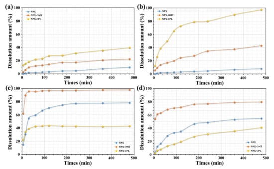 Dissolution studies were carried out on an RC12AD dissolution instrument (Tianda Tianfa, Tianjin, China), following basket method at 100 r·min−1 [44]. The dissolution mediums (450 mL) at 37 °C, water (pH 7.0), phosphate buffer (pH 6.8), acetate buffer (pH 4.5), and hydrochloric buffer (pH 1.2), respectively, and solid samples equivalent to 30 mg NPX were added to the dissolution mediums. The sampling points were set at 5, 15, 30, 60, 90, 120, 180, 240, 360, and 480 min. The concentrations of NPX were quantified on an Agilent high-performance liquid chromatography system (Agilent 1200 series, East Brunswick, NJ, USA) with a Welch Materical XB-C18 column (4.6 mm × 250 mm, 6 µm), and the detection wavelength was 235 nm. The mobile phase was prepared with methanol: 0.4% phosphoric acid (70:30); the flow rate was 1 mL·min−1, and column temperature was set at 30 °C.