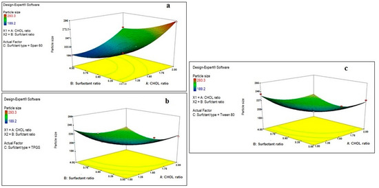 Effect of CHOL and surfactant ratio on the particle size of drug-free niosomes at different surfactant types ((a): Span 60, (b): TPGS, (c): Tween 80).