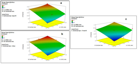 Regarding the effect of different factors on the Z-potential of the prepared drug-free niosomes, both CHOL and surfactant ratio have a positive effect on the Z-potential, while surfactant type has a non-significant effect with non-significant interaction between any two factors, Table 2 and Figure 2, with the final equation in terms of coded factors as: