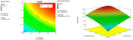 Responses constraints (particle size was minimized and Z-potential was maximized) were applied to determine the optimum levels of the variables through numerical optimization. The prepared optimized formulations were characterized, and no major residual error was found, indicating the validity of numerical optimization for this study. Different solutions were obtained with the first one having a desirability of 1, as shown in Figure 3, at which the formulation has a particle size of 186.9 nm and a Z-potential of −32.25 mV and consists of TPGS surfactant in a molar ratio of 3.99 with a CHOL molar ratio of 1.91. These results can be represented by F9, which was selected for drug loading. The selected particle size could improve the phagocytosis by macrophages and prolong the plasma drug concentration [55].