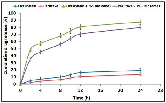 The release pattern of Oxaliplatin–TPGS niosomes and Paclitaxel–TPGS niosomes in comparison with the free drugs is shown in Figure 4. Both drugs were released from the prepared niosomes at a higher rate than their free drugs. For Oxaliplatin–TPGS niosomes, 87.5 ± 1.99% was released after 24 h compared to 19.4 ± 1.76% from the free drug. For Paclitaxel–TPGS niosomes, 80.81 ± 2.98% was released after 24 h compared to 14.77 ± 0.98% from the free drug. The High EE% and small particle size of the prepared niosomes may be the reason for higher drug release from the prepared niosomes in addition to the hydrophilicity of the TPGS outer shell. The small vesicles size partitions the drug in nanosized particles (<300 nm). In addition, the presence of the surfactant as TPGS, which has a high HLB value and high concentration, facilitated the penetration of release medium to the niosomes surface and into the cores, thus improving the drug release pattern.