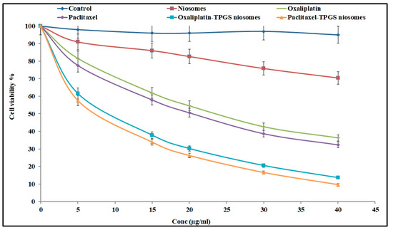 The cytotoxicity study on HT-29 (human colon adenocarcinoma) cells using an MTT (tetrazolium salt 3-[4,5-demethylthiazol-2-yl]-2-5-diphenlytetrazolium bromide) colorimetric method was completed for the following formulations: Oxaliplatin–TPGS niosomes, Paclitaxel–TPGS niosomes, drug-free niosomes (F9); Oxaliplatin and Paclitaxel solutions were used as positive controls. HT-29 cells were seeded in 96-well plates at a density of 5 × 103 cells and then incubated for 24 h at 37 °C. The tested cells were treated with series concentrations of the tested formulations (all containing an equivalent concentration) separately for 24 h at 37 °C. Cell viability was evaluated with MTT on a Synergy 2 Multi-Detection Microplate Reader by BioTek Instruments, Inc at 570 nm. Six independent experiments were conducted, and the inhibitory concentration (50%) (IC50) was determined. Results were expressed as mean ± SD compared to the negative control of untreated cells (100% proliferation) [82].