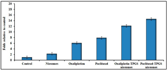 The anticancer drugs’ toxicity could be convoluted by apoptosis mechanism [66]. Figure 7 shows the apoptosis result related to the effect of different tested formulations. The apoptotic activity of niosome formulations (Oxaliplatin–TPGS–niosomes and Paclitaxel–TPGS–niosomes) was remarkably higher than that of their free drugs and plain noisome formulation. The noticed free niosomes apoptotic activity was due to the presence of TPGS. It was reported that TPGS can induce cancer cell apoptosis through different mechanisms, either by helping in the destruction and inhibition of the mitochondrial respiratory complex [67] or through induction of DNA damage or oxidation of lipid, protein, and enzyme, leading to cell destruction [68]. This is in agreement with previously reported findings that TPGS has been approved by the FDA as a P-glycoprotein (P-gp) inhibitor, which is an extracellular transporter that influences the pharmacokinetics (PK) of various compounds. Thus, TPGS could enhance the bioavailability and reverse MDR (modified drug release) [66,67,69]. The latter explains the higher niosomes-mediated delivery of the drugs to the cancer cells than the free drugs. It was reported previously that using non-ionic surfactants for niosomes preparation is promising due to their inhibitory effect of p-glycoprotein, which significantly increases the bioavailability of some anticancer drugs [70,71]. The niosomes’ vesicles size also plays an important role in their cell penetration and, consequently, absorption and targeting, as particles with sizes less than 200 nm show higher cellular drug uptake for cancer therapy [72,73]. In addition, the presence of CHOL in the niosomes’ structure could enhance cellular uptake due to the interaction between CHOL and the biological membranes [74]. There was no significant difference between the effect of Oxaliplatin–TPGS–niosomes and Paclitaxel–TPGS–niosomes (p < 0.05). These results demonstrate that niosomes represent a promising drug delivery system for anticancer drugs in colorectal cancer therapy. It could also be used to target tumor cells and prolong circulation in the body.