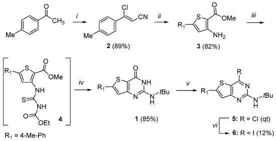 Compound 1 was prepared according to the method described by Cohen et al. (Scheme 1) [18]. Briefly, 4-methylacetophenone was treated with phosphoryl trichloride and hydroxylamine hydrochloride in dimethylformamide (DMF) at room temperature to generate compound 2 in an 89% isolated yield. This latter was reacted with methyl thioglycolate in the presence of sodium methylate in methanol to afford methyl 3-amino-5-(p-tolyl)thiophene-2-carboxylate 3, which was isolated in an 82% yield. Then, the condensation of 3 with ethoxycarbonyl isothiocyanate in DMF led to a thiourea intermediate, which was then reacted with tert-butylamine, triethylamine, and EDCI·HCl (1.2 eq) as a coupling agent to form a guanidine intermediate. Finally, the heating of the reaction mixture allowed its cyclization and subsequent deprotection to offer compound 1 in an overall three-step yield of 85%. The chlorination of 1 led to 5, which was isolated in a quantitative yield. A halogen exchange was then realized using an excess of sodium iodide in a dioxane reflux. Under these conditions, the conversion was revealed to be slow and incomplete, even after 72 h of reaction. Finally, compound 6 was isolated only in a 12% yield as a formic acid salt, after a preparative HPLC.
