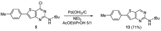 Using these conditions, a series of five other boronic acids were used and the corresponding 4-(hetero)arylthienopyrimidines 11b–f were obtained in good yields (66–80%) after purification. Three 4-alkynyl-substituted derivatives were synthesized according to the conditions described by Wang et al. [21]. Compounds 12a–c were obtained after purification in low to moderate yields (7–35%), due to purification difficulties (compounds 12a and 12c). Finally, the 4-unsubstituted derivative 13 was synthesized from 5, using the conditions described by Muraoka et al. (Scheme 5) [22]. After 3 days of reaction at room temperature, compound 5 was fully converted into 13, which was isolated after chromatography in a 71% yield. The structure of compound 13 was confirmed by 1H NMR with the appearance of a new singlet at 8.88 ppm (Supplementary Materials).