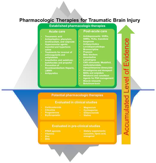 Traumatic brain injury (TBI) is a sudden injury that causes damage to the brain. Sixty-nine million individuals worldwide are estimated to sustain a TBI each year [1]. Pharmacologic therapies play important roles in mild to severe TBI. There are several pharmacologic therapies recommended by guidelines, which have proven efficacies and well-documented safety profiles for use in acute and post-acute TBI patients [2]. In addition, several new preclinical and clinical studies of pharmacologic therapies for TBI have been published recently, which could contribute to the addition of new agents into standard TBI management in the future. This review discusses current and potential pharmacologic therapies for TBI. We also summarize the pharmacologic therapies for TBI in Figure 1.