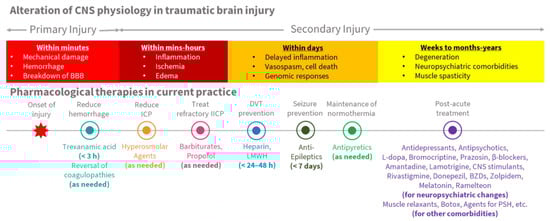 Subsequent processes, including delayed inflammation, vasospasm, cell death and genomic responses, develop within days. Cellular degeneration, neuropsychiatric comorbidities and muscle spasticity are noted over the next few weeks to months. Recent advances in biomarkers, including microRNA, have enhanced our understanding of the pathophysiologic process and could even help researchers to determine the time elapsed since an injury [3,4,5]. In current practice, pharmacological therapies are provided to treat both the acute and chronic effects of these pathological processes.