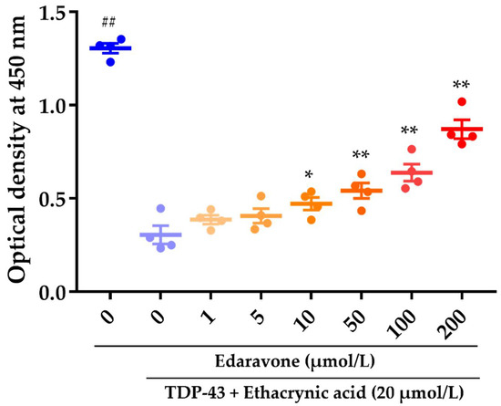 In the present study, we generated a TDP-43 proteinopathy cellular model using adult rat neural stem cells from line 1464R coinfected with adenoviruses expressing WT and CTF TDP-43 [12,13]. The viability of these cells was significantly decreased upon exposure to oxidative stress induced with 20 μmol/L ethacrynic acid (Figure 1). Pretreatment with edaravone 24 h before ethacrynic acid stimulation inhibited cell death associated with TDP-43 proteinopathy at ≥10 μmol/L in a concentration-dependent manner (Figure 1). Simultaneous treatment of edaravone with ethacrynic acid stimulation also showed neuroprotective efficacy (Supplemental Figure S1). In addition, without ethacrynic acid stimulation, the viability of 1464R-derived cells expressing TDP-43 was not different from normal cells at 48 h but decreased after 96 h (Supplemental Figures S2 and S3). Edaravone prevented the reduction in viability of cells expressing TDP-43 under standard conditions without oxidative stress (Supplemental Figure S3).