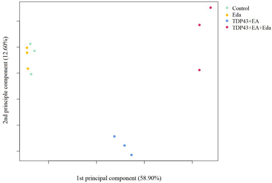 There was no significant outlier in any group, and samples from the TDP-43 + EA group (Group 3) were distributed close to each other and were separated from the samples in the Control group (Group 1). Additionally, the samples from the TDP-43 + EA + Eda group (Group 4) showed a similar distribution pattern. The samples from the Control (Group 1) and Eda (Group 2) groups were closer to each other compared to samples from the other groups, implying a relatively similar gene expression among these samples.