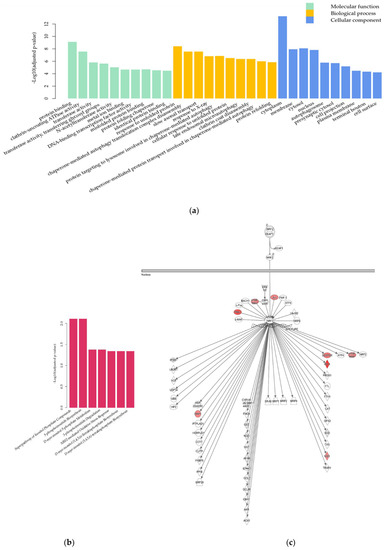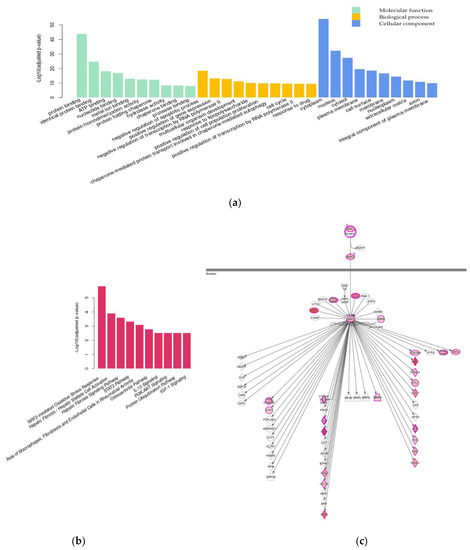 Gene Ontology (GO) enrichment analysis and pathway analysis of differentially expressed genes (DEGs) upon edaravone treatment of differentiated neuronal cells under the neurotoxic condition induced by TDP-43 and ethacrynic acid. (a) The top 10 significantly enriched GO terms according to a hypergeometric test p-value adjusted with the Benjamini–Hochberg (BH) procedure. Green bars: GO terms in molecular function category; orange bars: GO terms in biological process category; blue bars: GO terms in cellular component category. (b) Significant pathways (BH-adjusted p-value ≤ 0.05). (c) The illustration of the Nrf2-mediated oxidative stress response pathway is generated using the Ingenuity Pathway Analysis software. Red objects represent genes that were upregulated with the addition of edaravone to differentiated neuronal cells under the neurotoxic condition induced by TDP-43 and ethacrynic acid.