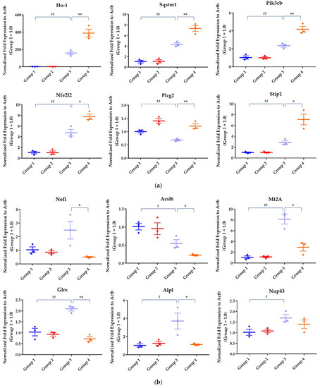 Pathway analysis identified seven significant pathways (Figure 5b), mostly cellular membrane lipid-associated pathways, such as 3-phosphoinositide biosynthesis, and the Nrf2-mediated oxidative stress response pathway. Among the genes in the lipid metabolism pathways, the expression of alkaline phosphatase, biomineralization-associated (ALPL) was downregulated in neuronal cells overexpressing TDP-43 in the presence of ethacrynic acid and upregulated upon edaravone treatment. These cellular membrane lipid-associated pathways were complemented by other pathways significantly differing between the Control (Group 1) and TDP-43 + EA (Group 3) groups, which are listed in Supplemental Table S2. The upregulated DEGs following edaravone treatment included heme oxygenase-1 (Ho-1), glutathione-disulfide reductase (GSR), sequestosome 1 (SQSTM1), and stress-induced phosphoprotein 1 (STIP1) in the Nrf2-mediated oxidative stress response pathway (Figure 5c), supporting the involvement of oxidative stress and autophagy response mechanisms in neuronal cells. Table 2 shows the list of representative genes whose expression was significantly changed by edaravone treatment. The results of quantitative real-time polymerase chain reaction (qPCR) were mostly correlated with DEGs of RNA sequencing (Figure 6). Edaravone upregulated the expression of genes in the Nrf2 pathway, including Ho-1, SQSTM1, STIP-1, nuclear factor, erythroid 2-like 2 (Nfe2l2), and lipid metabolism-related genes (including phosphatidylinositol-4,5-bisphosphate 3-kinase, catalytic subunit beta (Pik3cb), and phospholipase C gamma 2 (Plcg2)) in ethacrynic acid-treated TDP-43 expressed cells (Group 3 vs. Group 4, Figure 6a). On the other hand, genes that were downregulated by edaravone included ALPL, glutaredoxin (Glrx), neurofilament light (Nefl), acyl-CoA synthetase long-chain family member 6 (Acsl6), and metallothionein 2A (Mt2A) (Group 3 vs. Group 4, Figure 6b).