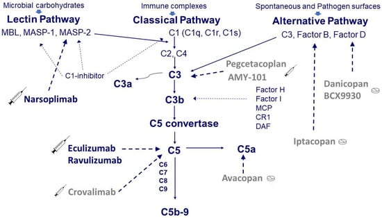 Avacopan is an orally-administered inhibitor of the complement C5a receptor successfully used as adjuvant treatment in antineutrophil cytoplasmic antibody (ANCA)-associated vasculitis [60]. It is also included in ongoing clinical trials on C3 glomerulopathy (ClinicalTrials.gov. NCT03301467), hidradenitis suppurativa (NCT03852472), IgA nephropathy (NCT02384317), and atypical hemolytic uremic syndrome (NCT02464891).