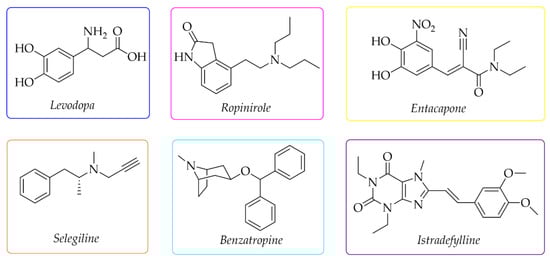 Current therapy of PD can only alleviate symptoms and slow down the progression of the disease [1,2,3], but not cure it. The used drugs depend on the stage of PD. The first-choice drug is levodopa (Figure 1), a dopamine precursor which is easily transported to the brain and metabolised to DA. For early treatment, DA agonists are also used (e.g., ropinirole), as well as monoamine oxidase B (MAO B) inhibitors (e.g., selegiline), catechol-O-methyltransferase (COMT) inhibitors (e.g., entacapone), and drugs with cholinergic activity (e.g., benzatropine) (Figure 1) [8,9]. Recently, the first adenosine A2A receptor antagonist—istradefylline (Japan-2013, FDA-2019)—was also approved as an add-on treatment to levodopa to increase its effectiveness and improve motor dysfunctions [10,11].