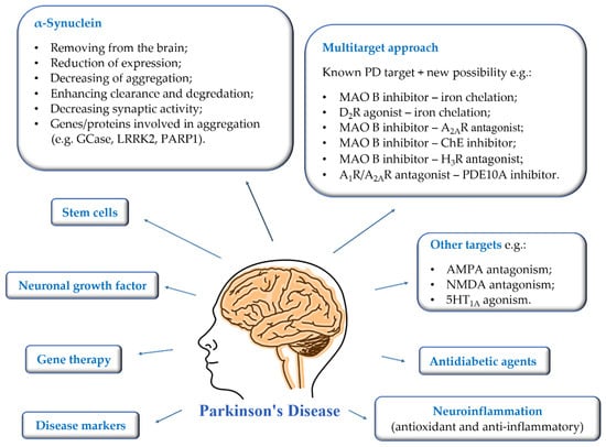First of all, the most important is to find disease markers that could be mass-used and allow early-stage detection. Then it will be possible to introduce treatment that could reduce the rate of disease progression. Gene therapy, intracerebral administration of neuronal growth factors, and stem cells are being developed at a significant pace. The mechanisms of brain stimulation are constantly improved, and new anatomical targets are sought to improve as many symptoms of the disease as possible. Moreover, new targets or multitarget approaches are proposed for therapy to prevent and reduce the rate of disease progression [3,12,13,14]. The utility of some of them is verified in clinical trials [1,3,13].