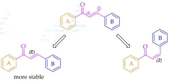 Especially interesting are multitarget strategies, as acting independently on a few targets involved in pathogenesis and development in PD could induce the desired pharmacological effect. In the search for new and effective drugs for PD, many scientists from universities and industry are engaged. Among many synthesised compounds, chalcones are promising candidates for this treatment due to a simple chemical scaffold occurring in many natural products. They can be found in vegetables, fruits, teas, and other plants [15]. They are open-chain flavonoids containing a benzylideneacetophenone scaffold in which two aromatic nuclei (ring A and B) are linked by an α, β-unsaturated carbonyl bond (Figure 3) [15,16]. Chalcones exhibit a lot of biological activities, e.g., anti-inflammatory, anti-bacterial, anti-cancer, anti-diabetic, anti-viral, anti-oxidant, as well as central nervous system (CNS) activities [17,18,19]. The presence of the α, β-unsaturated bond in the neighbourhood of the carbonyl group is responsible for the biological activity of these compounds. Elimination of this feature renders these compounds inactive [16]. Chalcones are Michael acceptors and could form covalent bonds with nucleophiles, e.g., the sulfhydryl group of cysteine residues in cellular peptides and proteins [20]. Moreover, chalcones can exist as two isomers cis (Z) and trans (E), but E isomers are more thermodynamically stable (due to the lack of steric interaction between the ring B and the carbonyl group) (Figure 3).