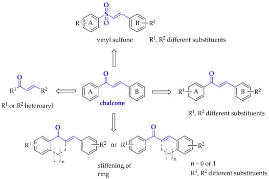 Moreover, here we also describe compounds closely related to chalcones: aurones, benzoyl benzofurans, benzylidene-tetralones, benzylidene-indanones, and vinyl sulfones. General modification ways observed in chalcones connected with PD are shown in Figure 5. Compounds are discussed according to biological targets connected with PD: MAO B, α-synuclein, adenosine A1 and A2A, oxidative stress, and neuroinflammation.