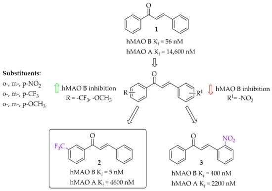 Iacovino et al. [27] described human MAO B (hMAO B) inhibitors as a series of mono-substituted chalcones containing electron-donating (-CF3, -CH3) or electron-withdrawing (-NO2) substituents. All of 17 synthesised compounds were first tested in vitro for cytotoxicity on cancer cell lines (ovarian carcinoma A2780, colorectal adenocarcinoma HT-29, and biphasic mesothelioma MSTO-211H). Then, compounds that were non-cytotoxic in all tested lines (GI50 > 20 µM) were further evaluated for inhibitory activity against hMAO B and human MAO A (five compounds). Due to the small number of compounds it was difficult to see any general relation between structure and activity but the strongest inhibitor was a compound containing a -CF3 group in the meta position (compound 2; Figure 7) at the A ring. This compound acted as a competitive reversible inhibitor of hMAO B, showing an inhibition constant value with a Ki of 5 nM. Interestingly, “pure” chalcone moiety (compound 1; Figure 7) showed good inhibitory activity with a Ki of 56 nM. Substitution in the B ring with -NO2 substituent especially in the ortho position (compound 3; Figure 7) was unfavourable as it weakened the inhibitory activity (Ki = 400 nM). All compounds proved to be weak hMAO A inhibitors (Ki ≥ 2.2 μM). Molecular docking studies of 2 showed that this compound binds to the active site with the -CF3 group in the entrance to cavity space, whereas crystallographic analysis (crystal structure of hMAO B with compound 2) showed that the -CF3 group played a key role in this orientation to the active site [27].