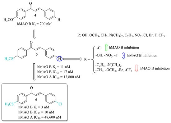 The development of new potent hMAO B inhibitors with a thioether group was led by Mathew et al. [28]. The researchers synthesised eleven chalcones and evaluated their ability to inhibit hMAO B and hMAO A. The thiomethoxy group (-SCH3) was introduced into the A ring at the para position, and the various substituents at the para position in the B ring. All compounds exhibited good inhibitory activity for hMAO B with IC50 values < 150 nM. The parent compound 5 (without any substituent on the B ring) (Figure 8) showed good inhibition of hMAO B (IC50 = 17 nM; Ki = 11 nM). The obtained results were better than for the methoxylated analogue 4 (Ki = 700 nM). Thus, the -SCH3 group at the para position of the chalcone A ring potentiated the inhibitory effect of hMAO B. Substituents in the B ring had a different influence on inhibitory activity. The introduction of -N(CH3)2, -CH2CH3 and -CH3 groups as well as -OCH3, -CF3 and -Br to this ring resulted in a decrease of inhibitory activity in comparison with compound 5. Compounds with -OH, -NO2 or -F group had comparable inhibitory activity to the compound 5. Only compound with the -Cl substituent on the B, compound 6 (Figure 8) showed slightly higher inhibitory activity (IC50 = 10 nM; Ki = 3 nM) than compound 5. Opposite to that all compounds had a weak inhibitory activity of hMAO A (IC50 > 5 µM). Both compounds 5 and 6 (as the most promising) were selected for further studies. Kinetic and reversibility studies confirmed competitive and reversible inhibition of hMAO B by them. Moreover, very high blood–brain barrier permeability for both compounds was estimated in PAMPA assay (Pe > 15 × 10−6 cm/s). Furthermore, little toxicity to Vero cells (IC50 > 110 μg/mL) and ability of compounds to lower the H2O2-induced ROS level in these cells was observed [28].