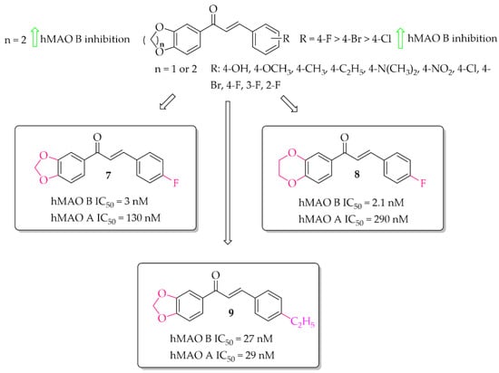 Oxygen derivatives of chalcones as hMAO B inhibitors were investigated by Parambi et al. [29]. Researchers synthesised 26 compounds containing either methylenedioxymethyl (1,3-benzodioxole) or ethylenedioxymethyl (1,4-benzodioxane) group as the A ring of the chalcone moiety. Changes were made on the B ring of the chalcone moiety where different substituents were introduced in the para position. All tested compounds showed strong inhibitory activity against hMAO B (IC50 < 70 nM). Structure–activity relationship analysis showed that the derivatives containing benzo-1,4-dioxane ring exhibited better hMAO B inhibitory activity than the chalcones containing benzo-1,3-dioxole ring. On the other hand, in both cases a very positive effect of halogen substituents, particularly the fluorine atom, was observed. The most active compounds in these series showed very high hMAO B inhibition with an IC50 below 5 nM, i.e., compound 7 (IC50 = 3 nM; Figure 9) and compound 8 (IC50 = 2.1 nM; Figure 9). All compounds were also tested for hMAO A inhibitory activity and results showed that most compounds potently inhibited this enzyme, too. The strongest hMAO A inhibitor was compound 9 (Figure 9) with similar activity towards both enzymes (hMAO A IC50 = 29 nM; hMAO B IC50 = 27 nM). Kinetic and reversibility studies of the most potent compounds (7–9) showed competitive and reversible inhibition of hMAO B by compounds 7 and 8, and the same kind of inhibition by compound 9 for hMAO A. In cytotoxicity studies in rat spleen cells, compounds 7 and 8 showed a very weak toxic effect at a dose of 200 μg/mL (11% and 4% cell death, respectively). These results encouraged researchers to check activity of these compounds 7 and 8 in in vivo studies [30]. Thus, compounds 7 and 8 were evaluated in the haloperidol-induced murine model of PD. Catalepsy was induced by haloperidol at the dose of 1 mg/kg/day p.o. Compounds were tested in three doses: 10, 20, and 30 mg/kg/day p.o. for 21 days. Two control groups were used. In one of the disease control groups (a standard group), animals were treated with levodopa (20 mg/kg/day p.o.) plus carbidopa (2 mg/kg/day p.o.). Results showed a significant reduction of catalepsy by these compounds especially at the dose of 30 mg/kg/day p.o. The locomotor and exploratory behaviour of animals were evaluated in the open field test. Both compounds showed positive effects comparable with the standard group. A further anti-anxiety effect was observed in the hole-board test also at the dose of 30 mg/kg/day p.o. Moreover, compounds were also tested in the narrow beam-walk test to evaluate their influence on motor coordination and balance, especially the hind limbs. The time taken by mice to traverse the beam was dose-dependently decreased by both compounds, but more by compound 8. Further studies showed that these compounds increased the levels of anti-oxidant markers (SOD, CAT, and GSH) and decreased oxidative stress marker MDA. Additionally, compounds dose-dependently increased levels of neurotransmitters such as DA, acetylcholine, noradrenaline, and serotonin. A reduction of brain damage (neurofibrillary tangles and plaques) was also observed under a light microscope at 100× in the groups treated by both compounds with the dose of 30 mg/kg/day p.o. Thus, these results showed that the tested chalcones, especially 8, are promising candidates for the treatment of PD [29,30].