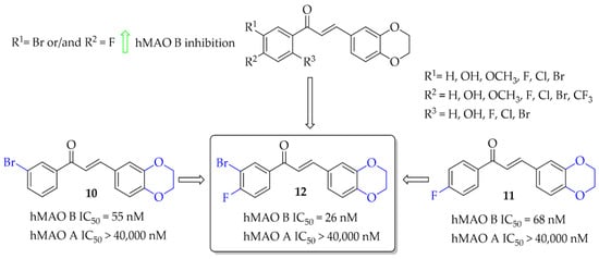 A series of 28 chalcone derivatives containing a 1,4-benzodioxane moiety was synthesised and evaluated for hMAO B and hMAO A inhibitory activity by Kong et al. [31]. Most of the compounds showed good inhibitory activity with IC50 < 350 nM. Structure–activity relationship analysis showed that the 1,4-benzodioxane moiety had a good influence on inhibitory activity, the same as a halogen atom, especially -Br (compound 10; Figure 10) or -Cl at the 3 or 6 position of the ring A. Compound 11 (Figure 10) with 4-F substituent had similar affinity to compound 10 (10: IC50 = 55 nM; 11: IC50 = 68 nM). The most potent in the whole series was compound 12 (Figure 10) with an IC50 value of 26 nM. None of compounds showed inhibition of hMAO A with IC50 < 40 μM. Performed kinetics and reversibility studies of compound 12 confirmed competitive and reversible inhibition of hMAO B. Cytotoxicity studies of compounds 10 and 12 were carried out in BV2 microglia cells and showed no significant decrease in cellular viability at tested concentrations (5 μM and 25 μM) [31].