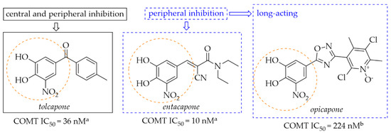 Chemical structures of second (tolcapone and entacapone)- and third (opicapone)-generation COMT inhibitors; aIC50 values in rat liver homogenates, data from ref. [36], bIC50 values in rat liver homogenates, data from ref. [38].