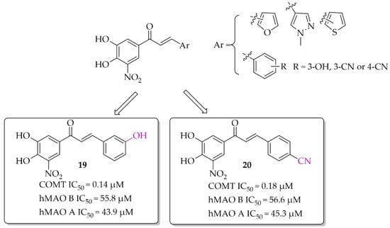 A series of chalcones (nine compounds) with a nitrocatechol moiety as a ring A was obtained by Hitge et al. [39]. Inhibitory activity of compounds on COMT (using soluble fractions of rat liver tissue) and hMAO B was investigated. The recorded IC50 values for COMT inhibition were below 0.30 μM and for hMAO B IC50 values were from 42 μM to 72 μM. All compounds were also tested for hMAO A inhibition and the results showed comparable inhibitory activity of chalcones to hMAO B inhibition (hMAO A: 43 μM < IC50 < 70 μM). Compounds 19 and 20 (Figure 15) are the most potent dual inhibitors in this series (COMT: IC50 = 0.14 μM for 19 and 0.18 μM for 20; hMAO B IC50 = 55.8 μM for 19 and 56.6 μM for 20). SAR analysis showed that all changes made in the ring B did not influence COMT inhibitory activity. Regarding hMAO B inhibition, observations were similar to de Beer et al. [37]; the nitrocatechol group is not beneficial in inhibiting this enzyme.