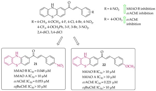 Yamali et al. [43] investigated 16 phenothiazine-based chalcones as potential inhibitors acting on hMAO B and AChE from electric eel (eeAChE). Phenothiazine moiety was as ring A. Ring B was substituted phenyl, tiophen, or benzo[1,3]dioxole. First, all compounds were screened in two concentrations (1 mM and 0.1 mM) for inhibitory potency for eeAChE, butyrylcholinesterase (from equine serum; eqBuChE), and hMAO B and hMAO A. Then, the most promising compounds were further evaluated to calculate IC50 values (two compounds for eeAChE and one for hMAO B). None of the compounds showed promising activity at 0.1 mmol against eqBuChE and hMAO A. The most active compound 21 (Figure 17) showed inhibitory activity for hMAO B with an IC50 value of 48 nM and eeAChE with an IC50 value of 53 nM. Structure–activity relationship analysis showed that compounds having a substituent in the para position at the phenyl ring (ring B) are the most active. Shifting these substituents to the ortho or meta position resulted in a decrease in activity. The most promising substituents were 4-NO2 (dual target activity) and 4-OCH3 (AChE inhibition; compound 22; Figure 17) [43].