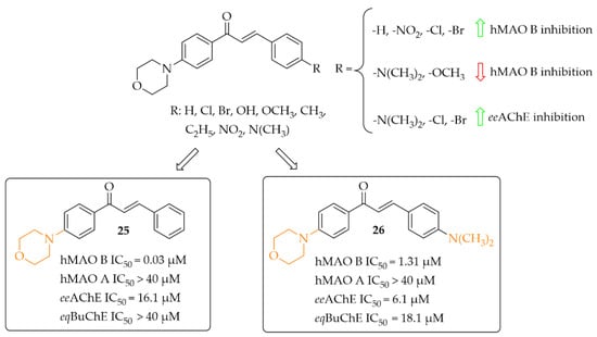 Nine morpholine-based chalcones were synthesissed by Sasidharan et al. [45]. Ring A was phenylmorpholine and ring B was substituted phenyl (Figure 19). Compounds were tested at 1 μM for hMAO B and at 10 μM for hMAO A, eeAChE, and eqBuChE. The study showed that most compounds exhibited strong inhibition of hMAO B (IC50 from 0.03 μM to 1.31 μM) and moderate to weak inhibition of eeAChE (IC50 > 6.1 μM). Moreover, compounds weakly inhibited hMAO A (IC50 > 7.1 μM) and eqBuChE (IC50 > 18.1 μM). Structure–activity relationship analysis showed that unsubstituted compound 25 (Figure 19) had the highest hMAO B inhibitory activity in the whole series (IC50 = 30 nM). An introduction of substituents such as -NO2, -Cl, and -Br improved the hMAO B inhibitory activity in comparison with other substituents (Figure 19). In contrast, the opposite effect was observed when -N(CH3)2 and -OCH3 groups were substituted. For eeAChE inhibition, an introduction of lipophilic groups such as -N(CH3)2, -Cl, and -Br enhanced inhibitory activity. The most active eeAChE inhibitor was compound 26 (Figure 19) with an IC50 of 6.1 μM. Further studies showed that compound 25 was a reversible mix-typed hMAO B inhibitor (Ki = 18 nM), whereas compound 26 proved to be a reversible competitive eeAChE inihibitor (Ki = 2.52 μM). In PAMPA assay both compounds showed high CNS permeability with Pe (×10−6 cm/s) values 16.34 and 14.44 respectively. ROS induced by 100 μg/mL of H2O2 in Hela cells was inhibited by 40 μg/mL of compound 25 and 26. The strongest effect was observed for compound 25. Thus, these two compounds are promising structures for further modification: compound 25 as a selective hMAO B inhibitor, and compound 26 as a dual-acting MAO B and AChE inhibitor [45].