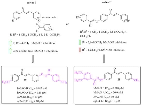 Compounds containing oxime ethers exhibit a variety of pharmacological activities, including antibiotic, antifungal, or anti-inflammatory properties [46]. Oh et al. [46], as a continuation of previous work [47], obtained 19 aldoxime chalcone ethers (ACE). The compounds were obtained by C-O coupling and their inhibitory activity towards hMAO B, hMAO A, ChEs and BACE-1 was evaluated. Two series of ACE were designed: series I (9 compounds) with a benzaldoxime group as the B ring, and series II (10 compounds) with a benzaldoxime group as the A ring. In the I series results showed that both the position of the benzaldoxime (para or meta), its substitution on the B ring, and the type of substituent on the A ring were crucial for increasing the inhibitory activity of the compounds towards hMAO B. From this series, compound 27 (Figure 20) had the strongest inhibitory activity of hMAO B with an IC50 of 12 nM [46]. Transferring the benzaldoxime group from the B ring to the A ring (series II) caused decreased hMAO B inhibition, in comparison with previously described compounds. The highest inhibitory activity among those compounds was compound 28 (Figure 20) with an IC50 of 18 nM [46]. None of compounds from these two series had nanomolar inhibitory activity for hMAO A. The most potent was compound 27 (Figure 20) with an IC50 of 1.49 μM. Moreover, none of the compounds tested showed any ability to inhibit ChEs and BACE-1 in a low micromolar range (IC50 > 10 μM) [46].