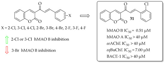A series of 10 coumarin-chalcones was described by Rehuman et al. [48]. Unsubstituted coumarin was as ring A, whereas halogenated phenyl moiety was ring B. Compounds were tested for inhibitory activity towards hMAOs, ChEs, and BACE-1. First, all compounds were screened at 10 μM for all biological targets. The obtained results showed that all compounds had inhibitory activity for hMAO B in a (sub)micromolar range and only two in a micromolar range for eqBuChE. None of the compounds showed promising inhibition of hMAO A, eeAChE, and BACE-1 (IC50 > 40 μM). The most potent was compound 31 (Figure 22) inhibiting hMAO B with an IC50 of 0.51 μM and eqBuChE with an IC50 of 7.00 μM. Compound 31 proved to be a competitive and reversible inhibitor of both these enzymes (hMAO B: Ki = 0.53 μM; eqBuChE: Ki = 2.84 μM). Toxicity studies on Vera cells showed that compound 31 was not toxic to these cells at concentrations up to 100 μg/mL. Furthermore, compound 31 exhibited neuroprotective effects by attenuating the toxic effects induced by H2O2 treatment (100 μg/mL of 30% H2O2 for 10 min) [48].