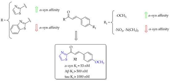 - Kaide, S.; Watanabe, H.; Iikuni, S.; Hasegawa, M.; Itoh, K.; Ono, M. Chalcone Analogue as New Candidate for Selective Detection of α-Synuclein Pathology. ACS Chem. Neurosci. 2022, 13, 16–26. [Google Scholar] [CrossRef]