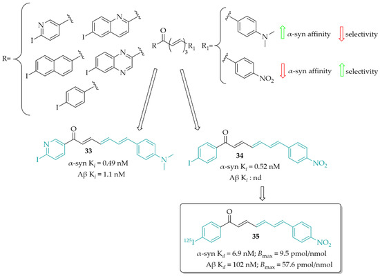 - Korat, Š.; Bidesi, N.S.R.; Bonanno, F.; Di Nanni, A.; Hoàng, A.N.N.; Herfert, K.; Maurer, A.; Battisti, U.M.; Bowden, G.D.; Thonon, D.; et al. Alpha-Synuclein PET Tracer Development-an Overview about Current Efforts. Pharmaceuticals 2021, 14, 847. [Google Scholar] [CrossRef] [PubMed]