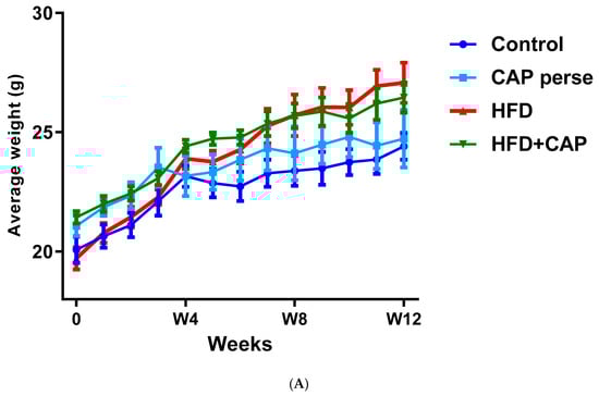 In mice that were fed HFD for 12 weeks, capsiate (2 or 10 mg/kg) blocked weight gain by reducing lipid accumulation in the white adipose tissue [18]. In other studies, however, capsiate had no effect on weight gain of the animals that were fed a HFD ad libitum unless combined with exercise training [19].