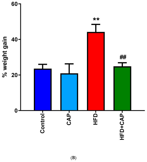 In C57BL/6 mice, capsaicin (2 mg/kg/day, per os) reduced weight gain by approximately 50% in animals that were kept on HFD (A,B), but had no effect on body weight in the normal chow group (B). Figure courtesy of Dr. Mahendra Bishnoi (based on [12]). ** p < 0.01 versus control animals, ## p < 0.01 versus HFD animals.