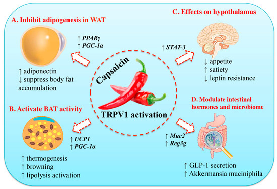 Molecular mechanisms of the anti-obesity effects of capsaicin. (A) Capsaicin can inhibit adipogenesis in preadipocyte and adipocyte by up-regulating the expression of peroxisome proliferator-activated receptor gamma (PPARγ) and uncoupling protein-1 (UCP-1). Thus, it will stimulate adiponectin secretion and increase body fat accumulation. (B) Capsaicin can activate brown adipose tissue (BAT) activity, accompanied by increased expression of UCP-1 and PPAR-coactivator-1α (PGC-1α). (C) Capsaicin can suppress appetite, increase satiety, and ameliorate insulin resistance. (D) Capsaicin can modulate its function in the gastrointestinal tract and gut microbiome, including stimulation of glucagon-like peptide-1 (GLP-1) secretion and increase in population of the gut bacterium Akkermansia muciniphila. STAT-3, and signal transducer and activator of transcription-3 (STAT3). Reproduced with permission from [66].