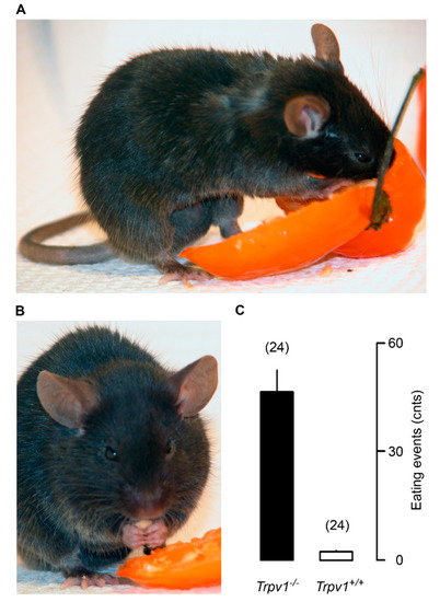 Trpv1 knockout mice are insensitive to capsaicin and eagerly consume habanero chili pepper (panel A), including the hottest parts such as the septa and the seeds (panel B). Panel (C) shows the mean number of pepper-eating events during a 20-min period. Reproduced with permission from [132].