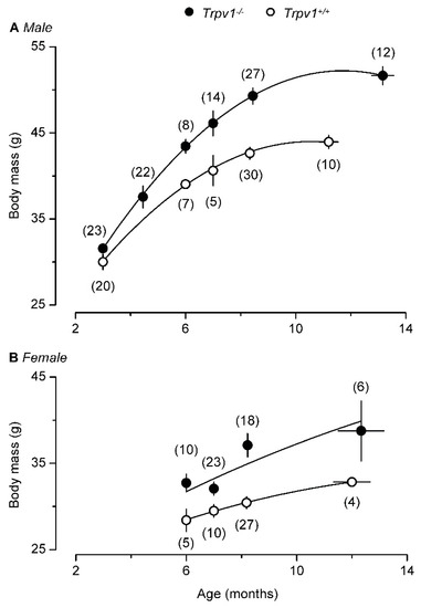 With age, both male (A) and female (B) TRPV1-null mice become heavier than their age-matched, wild-type controls. Reproduced with permission from [132].
