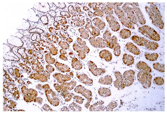TRPV1-like immunoreactivity was described in the human GI tract, from the stomach (Figure 5) through the duodenum to the colon [73,74,75]. In epithelial cells, no difference in TRPV1 expression was found between obese (BMI > 40 kg/m2) and control individuals [75].