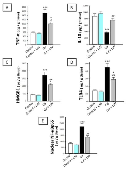 2.4. Linagliptin Administration Curtails Cadmium-Induced Pro-Inflammatory Events and HMGB1/TLR4/NF-κB Pathway Activation in Testes of Rats